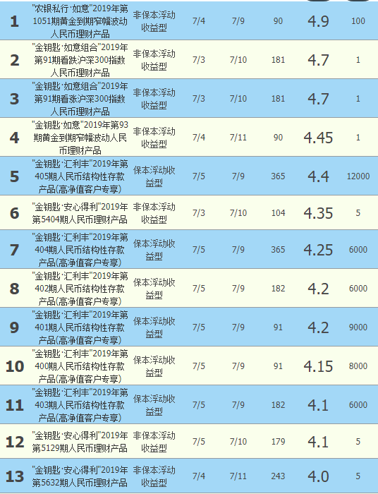 今日农业银行在售银行理财产品收益最高为“农银私行·如意2019年第1051期黄金到期窄幅波动人民币理财产品”,该款产品理财期限为90天,最高预期收益为4.9%,投资起点为100万元,该款产品7月4日-7月9日面向全国发售。