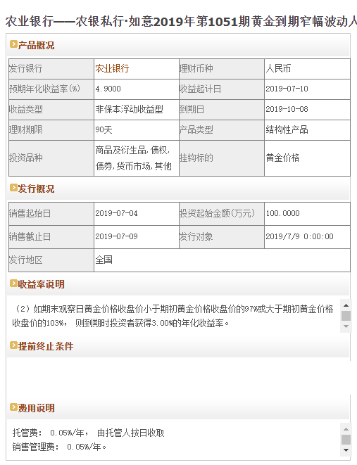 (1)如期末观察日黄金价格收盘价大于等于期初黄金价格收盘价的97%且小于等于期初黄金价格收盘价的103%,则到期时投资者获得4.90%的年化收益率;