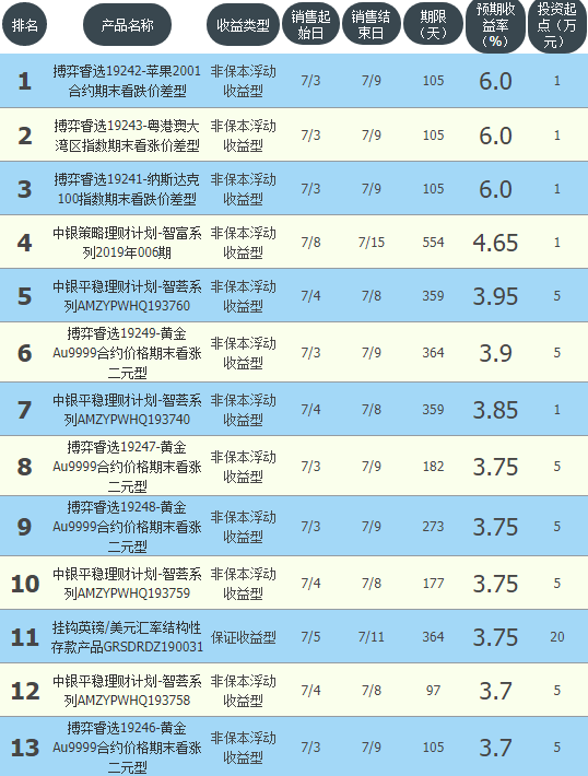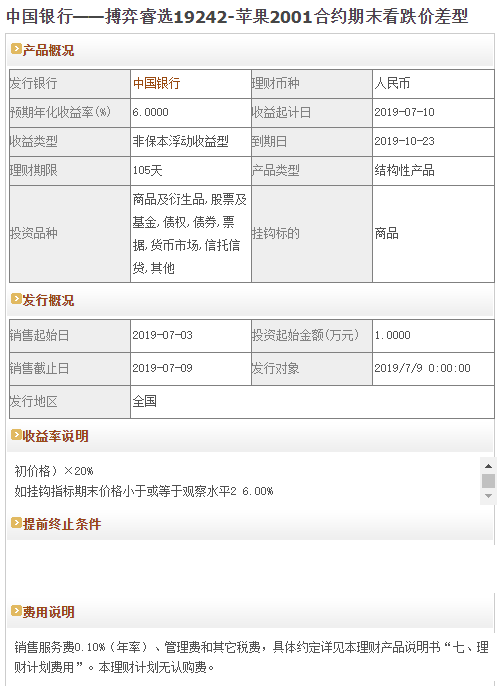 今日中国银行在售银行理财产品收益最高为“搏弈睿选19242-苹果2001合约期末看跌价差型”,该款产品理财期限为105天,最高预期收益为6.0%,投资起点为1万元,该款产品7月3日-7月9日面向全国发售。