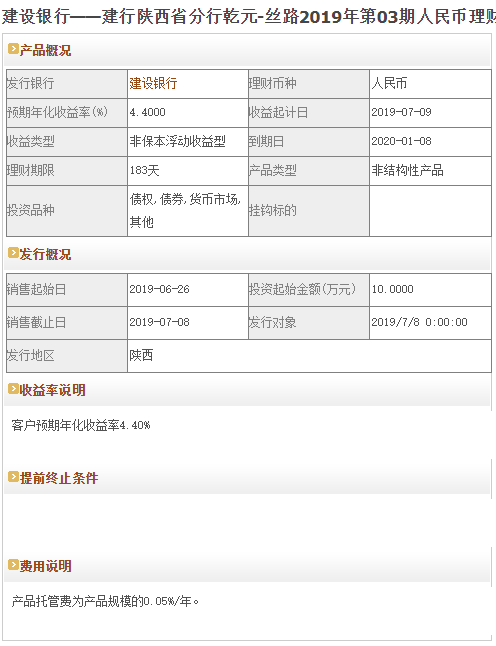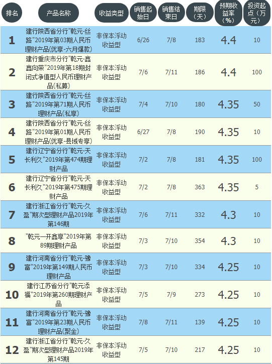 今日建设银行在售银行理财产品收益最高为“建行陕西省分行乾元-丝路2019年第03期人民币理财产品(优享-六月爆款)”,该款产品理财期限为183天,最高预期收益为4.4%,投资起点为10万元,该款产品7月26日-7月8日面向陕西发售。