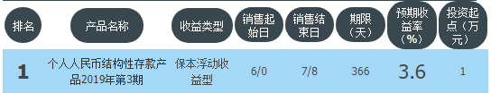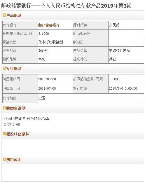 今日邮政储蓄银行在售银行理财产品收益最高为“个人人民币结构性存款产品2019年第3期”,该款产品理财期限为366天,最高预期收益为3.6%,投资起点为1万元,该款产品7月0日-7月8日面向全国发售。