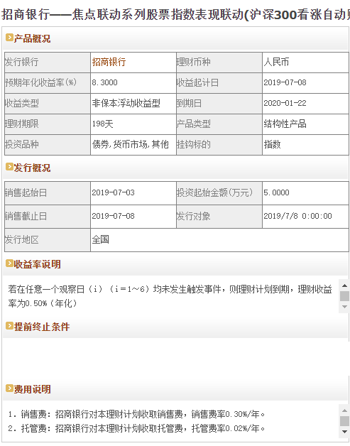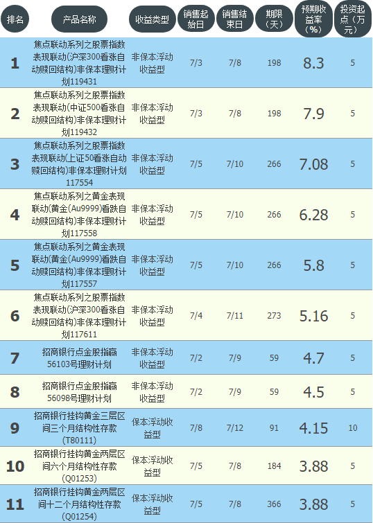 今日招商银行在售银行理财产品收益最高为“焦点联动系列股票指数表现联动(沪深300看涨自动赎回结构)非保本理财计划119431”,该款产品理财期限为198天,最高预期收益为8.3%,投资起点为5万元,该款产品7月3日-7月8日面向全国发售。