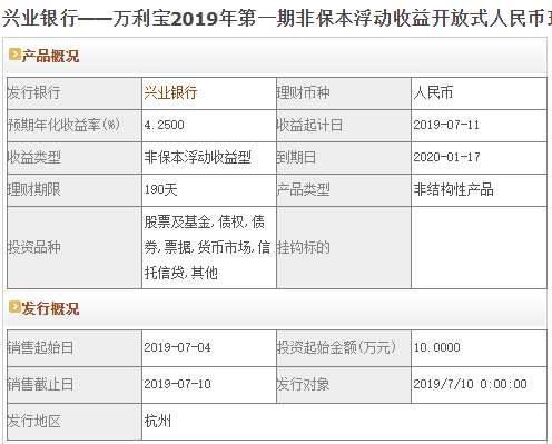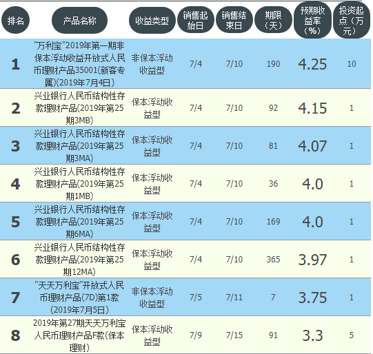 今日兴业银行在售银行理财产品收益最高为“万利宝2019年第一期非保本浮动收益开放式人民币理财产品35001(新客专属)(2019年7月4日)”,该款产品理财期限为190天,最高预期收益为4.25%,投资起点为10万元,该款产品7月4日-7月10日面向杭州发售。