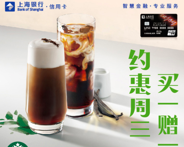 即日起至2019年7月31日,每周三持上海银行信用卡至星巴克江浙沪、北京、天津、深圳、成都地区指定合作门店,资格验证通过后刷卡即享指定手工调制饮品买一赠一。