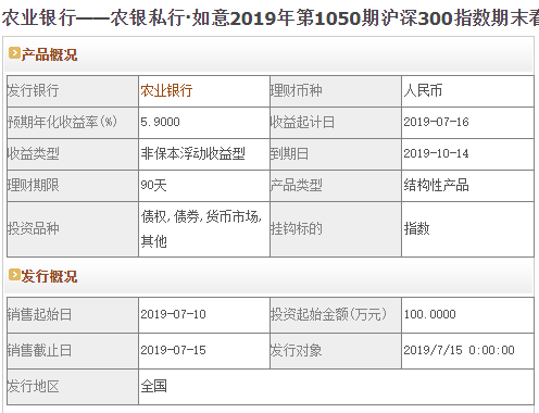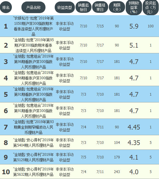 今日农业银行在售银行理财产品收益最高为“农银私行·如意2019年第1050期沪深300指数期末看涨连续型人民币理财产品”,该款产品理财期限为90天,最高预期收益为5.9%,投资起点为100万元,该款产品7月10日-7月15日面向全国发售。