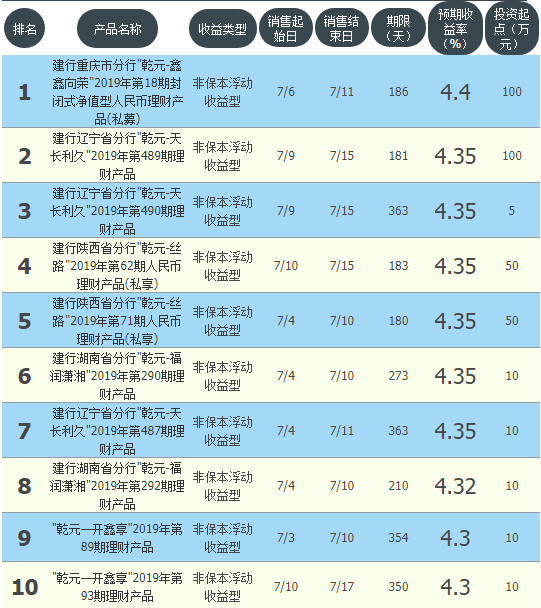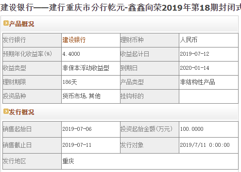 今日建设银行在售银行理财产品收益最高为“建行重庆市分行乾元-鑫鑫向荣2019年第18期封闭式净值型人民币理财产品(私募)”,该款产品理财期限为186天,最高预期收益为4.4%,投资起点为100万元,该款产品7月6日-7月11日面向重庆发售。