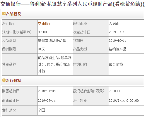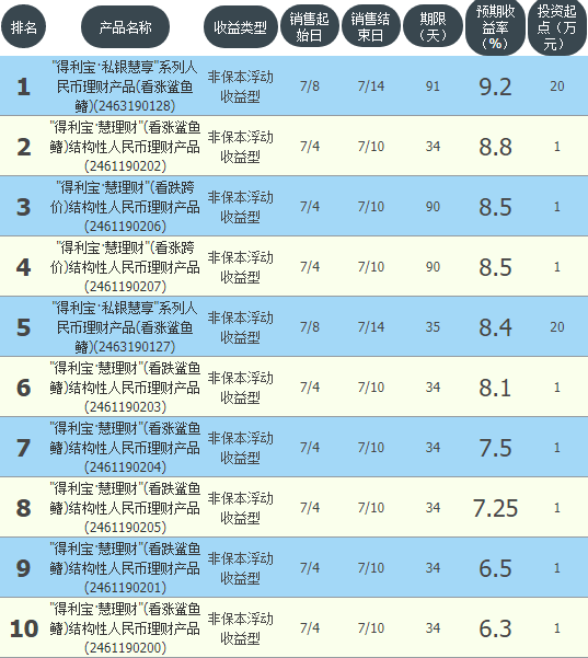 今日交通银行在售银行理财产品收益最高为“得利宝·私银慧享系列人民币理财产品(看涨鲨鱼鳍)(2463190128)”,该款产品理财期限为91天,最高预期收益为9.2%,投资起点为20万元,该款产品7月8日-7月14日面向全国发售。