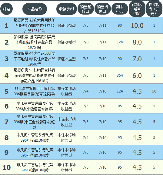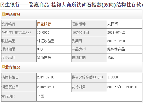 今日民生银行在售银行理财产品收益最高为“聚赢商品-挂钩大商所铁矿石指数(双向)结构性存款产品19619号”,该款产品理财期限为90天,最高预期收益为10.0%,投资起点为1万元,该款产品7月5日-7月11日面向全国发售。