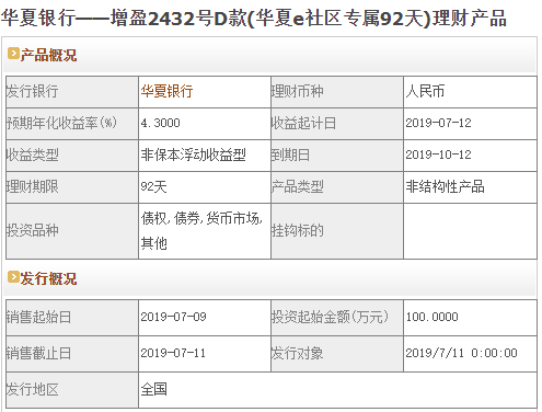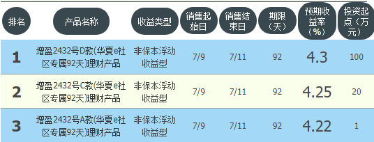 今日华夏银行在售银行理财产品收益最高为“增盈2432号D款(华夏e社区专属92天)理财产品”,该款产品理财期限为92天,最高预期收益为4.3%,投资起点为100万元,该款产品7月9日-7月11日面向全国发售。