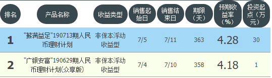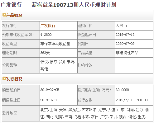 今日广发银行在售银行理财产品收益最高为“薪满益足190713期人民币理财计划”,该款产品理财期限为363天,最高预期收益为4.28%,投资起点为30万元,该款产品7月5日-7月11日面向北京,上海,天津,黑龙江,齐齐哈尔,辽宁,大连,山东,河南,江苏,浙江,湖北,湖南,云南,乌鲁木齐,喀什,广东,深圳,陕西,河北,重庆,发售。