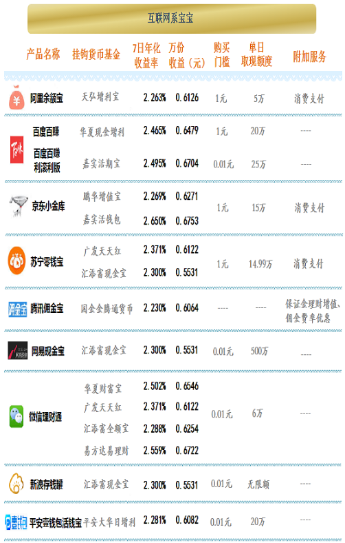 银行互联网理财收益前三名:第一,民生加银现金宝货币7日年化收益为2.759%;第二,嘉实薪金宝7日年化收益为2.659%;第三,南方薪金宝7日年化收益为2.652%。