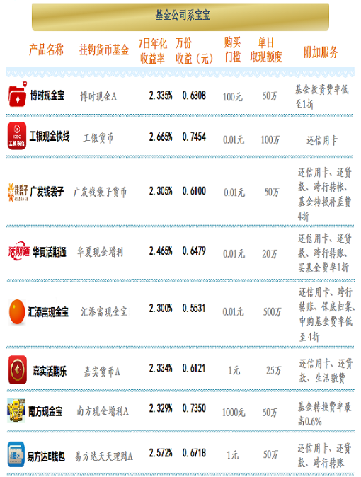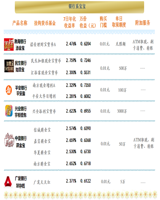 民生加银现金宝货币投资于法律法规及监管机构允许投资的金融工具,包括现金,通知存款,短期融资券,剩余期限在397天以内(含397天)的中期票据,期限在一年以内(含一年)的银行定期存款与大额存单,剩余期限在一年以内(含一年)的中央银行票据与债券回购,剩余期限在397天以内(含397天)的债券,剩余期限在397天以内(含397天)的资产支持证券,以及中国证监会、中国人民银行认可的其他具有良好流动性的货币市场工具。 7月11日,民生加银现金宝货币7日年化收益为2.759%,领衔各宝宝类理财产品。
