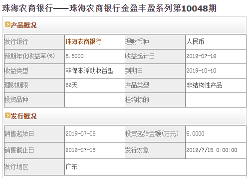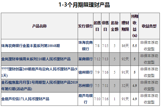 1-3个月银行理财中(非结构性)收益排名第一的为珠海农商银行——珠海农商银行金盈丰盈系列第10048期人民币理财,预期最高收益率为5.5%。销售起始日:2019-07-08;销售截止日:2019-07-15;理财期限:86天;发行地区:广东。