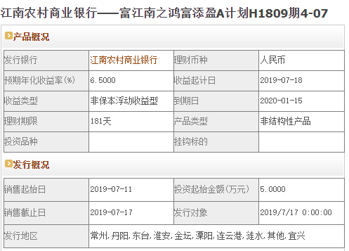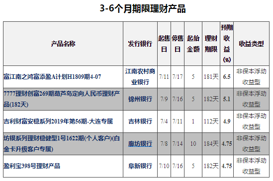3-6个月银行理财中(非结构性)收益排名第一的为江南农村商业银行——富江南之鸿富添盈A计划H1809期4-07人民币理财产品,预期最高收益率为6.5%。销售起始日:2019-07-11;销售截止日:2019-07-17;理财期限:181天;发行地区:常州,丹阳,东台,淮安,金坛,溧阳,连云港,涟水,其他,宜兴。