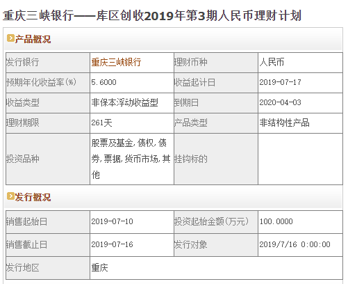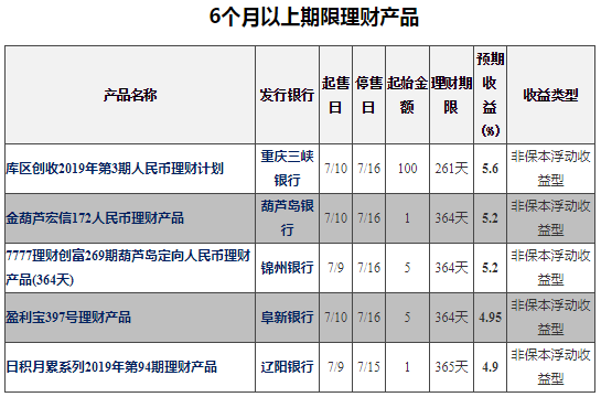 6个月及以上银行理财(非结构性)中收益排名第一的为重庆三峡银行——库区创收2019年第3期人民币理财计划人民币理财产品,预期最高收益率为5.6%。销售起始日:2019-07-10;销售截止日:2019-07-16;理财期限:261天;发行地区:重庆。