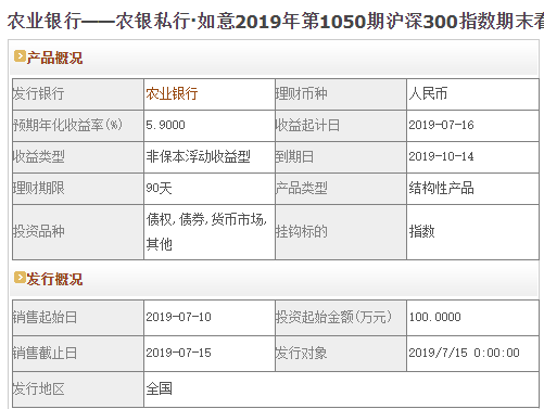 今日农业银行在售银行理财产品收益最高为“农银私行·如意2019年第1050期沪深300指数期末看涨连续型人民币理财产品”,该款产品理财期限为90天,最高预期收益为5.9%,投资起点为100万元,该款产品7月10日-7月15日面向全国发售。