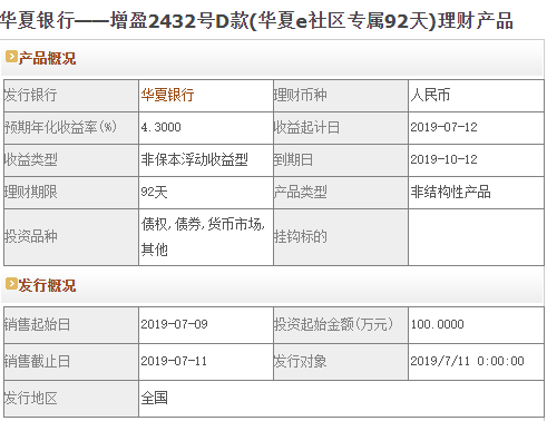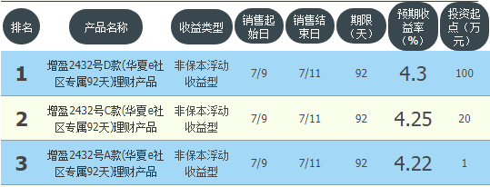今日华夏银行在售银行理财产品收益最高为“增盈2432号D款(华夏e社区专属92天)理财产品”,该款产品理财期限为92天,最高预期收益为4.3%,投资起点为100万元,该款产品7月9日-7月11日面向全国发售。