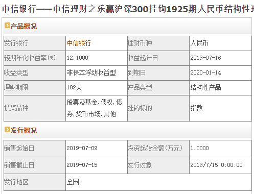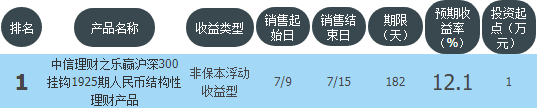今日中信银行在售银行理财产品收益最高为“中信理财之乐赢沪深300挂钩1925期人民币结构性理财产品”,该款产品理财期限为182天,最高预期收益为12.1%,投资起点为1万元,该款产品7月9日-7月15日面向全国发售。