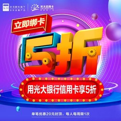 活动期间,用户在指定合作商户使用京东闪付、京东APP或京东金融APP“码支付”并选择光大银行信用卡完成支付,可享受5折优惠(单笔优惠20元封顶),同一用户每周限享受1次,每日优惠名额限量1800名,先到先得。