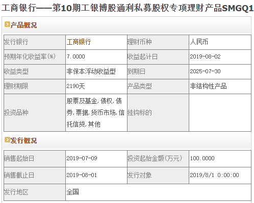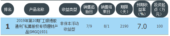 今日工商银行在售银行理财产品收益最高为“第10期工银博股通利私募股权专项理财产品SMGQ1931”,该款产品理财期限为2190天,最高预期收益为7.0%,投资起点为100万元,该款产品7月9日-7月1日面向全国发售。