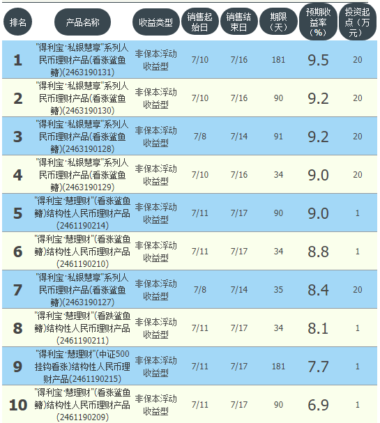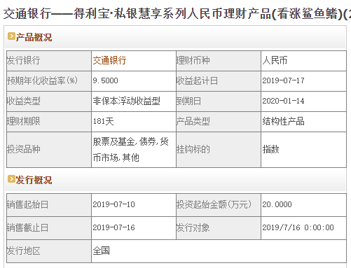 今日交通银行在售银行理财产品收益最高为“得利宝·私银慧享系列人民币理财产品(看涨鲨鱼鳍)(2463190131)”,该款产品理财期限为181天,最高预期收益为9.5%,投资起点为20万元,该款产品7月10日-7月16日面向全国发售。