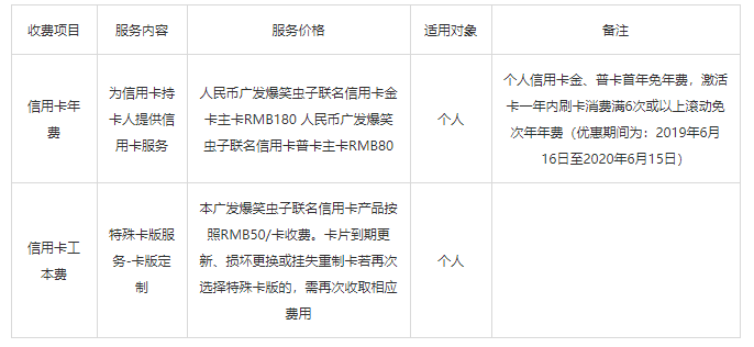 为给您提供更为优质的金融服务,我行将于2019年6月16日起新增广发爆笑虫子联名信用卡产品,现将相关收费标准公告如下: