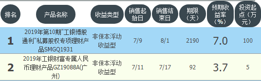 今日工商银行在售银行理财产品收益最高为“第10期工银博股通利私募股权专项理财产品SMGQ1931”,该款产品理财期限为2190天,最高预期收益为7.0%,投资起点为100万元,该款产品7月9日-7月1日面向全国发售。