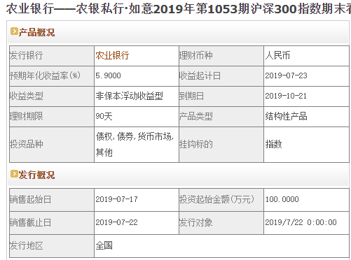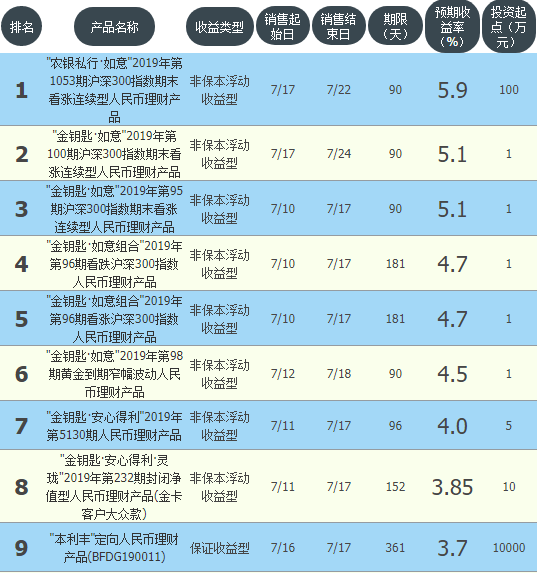 今日农业银行在售银行理财产品收益最高为“农银私行·如意2019年第1053期沪深300指数期末看涨连续型人民币理财产品”,该款产品理财期限为90天,最高预期收益为5.9%,投资起点为100万元,该款产品7月17日-7月22日面向全国发售。