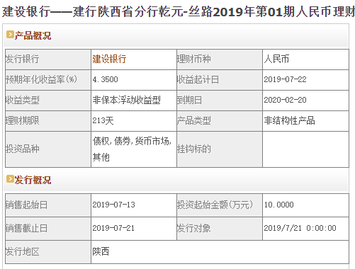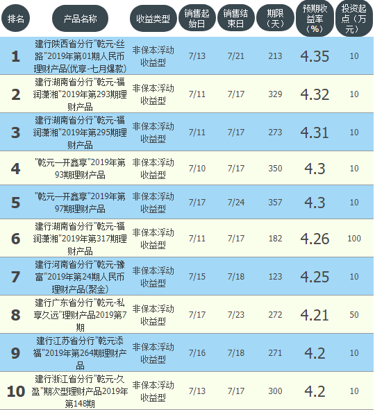 今日建设银行在售银行理财产品收益最高为“建行陕西省分行乾元-丝路2019年第01期人民币理财产品(优享-七月爆款)”,该款产品理财期限为213天,最高预期收益为4.35%,投资起点为10万元,该款产品7月13日-7月21日面向陕西发售。
