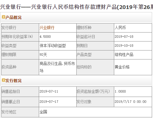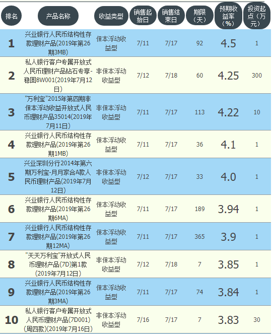 今日兴业银行在售银行理财产品收益最高为“兴业银行人民币结构性存款理财产品(2019年第26期3MB)”,该款产品理财期限为92天,最高预期收益为4.5%,投资起点为1万元,该款产品7月11日-7月17日面向全国发售。