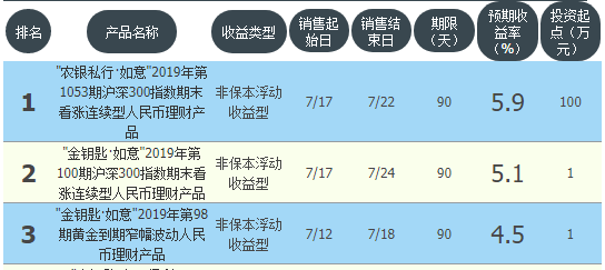 今日农业银行在售银行理财产品收益最高为“农银私行·如意2019年第1053期沪深300指数期末看涨连续型人民币理财产品”,该款产品理财期限为90天,最高预期收益为5.9%,投资起点为100万元,该款产品7月17日-7月22日面向全国发售。