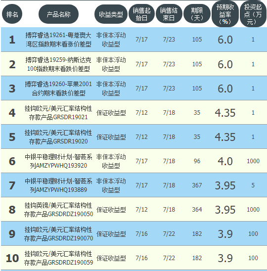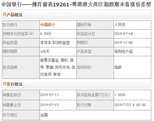 今日中国银行在售银行理财产品收益最高为“搏弈睿选19261-粤港澳大湾区指数期末看涨价差型”,该款产品理财期限为105天,最高预期收益为6.0%,投资起点为1万元,该款产品7月17日-7月23日面向全国发售。