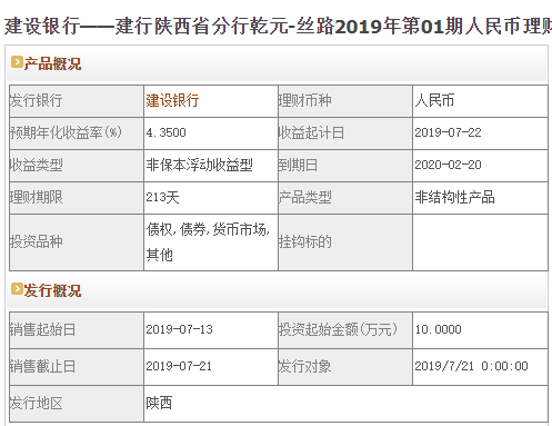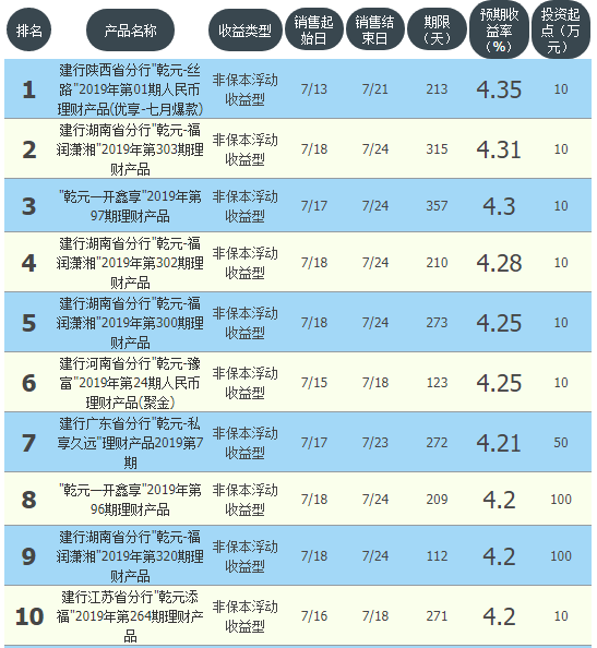 今日建设银行在售银行理财产品收益最高为“建行陕西省分行乾元-丝路2019年第01期人民币理财产品(优享-七月爆款)”,该款产品理财期限为213天,最高预期收益为4.35%,投资起点为10万元,该款产品7月13日-7月21日面向陕西发售。