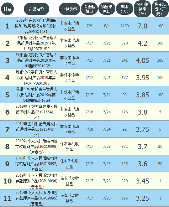 7月19日工商银行在售银行理财产品共有15款,平均收益率4.05%,其中保本型产品4款,平均收益率3.50%;非保本产品11款,平均收益率4.37%。