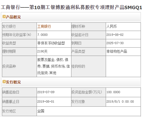 今日工商银行在售银行理财产品收益最高为“第10期工银博股通利私募股权专项理财产品SMGQ1931”,该款产品理财期限为2190天,最高预期收益为7.0%,投资起点为100万元,该款产品7月9日-7月1日面向全国发售。