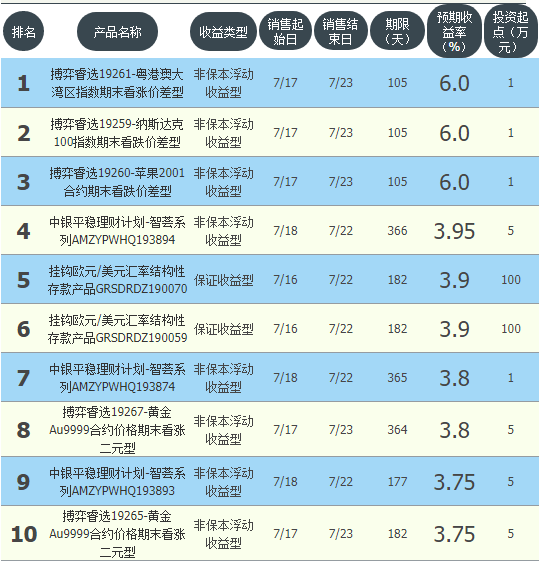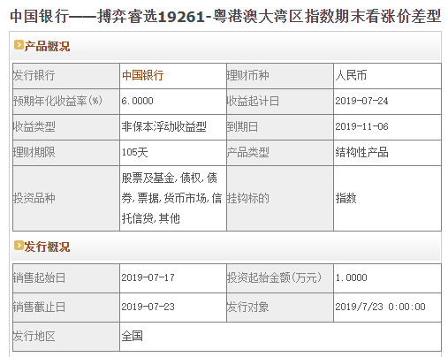 今日中国银行在售银行理财产品收益最高为“搏弈睿选19261-粤港澳大湾区指数期末看涨价差型”,该款产品理财期限为105天,最高预期收益为6.0%,投资起点为1万元,该款产品7月17日-7月23日面向全国发售。