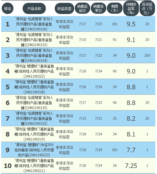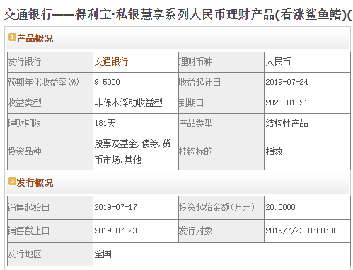 今日交通银行在售银行理财产品收益最高为“得利宝·私银慧享系列人民币理财产品(看涨鲨鱼鳍)(2463190136)”,该款产品理财期限为181天,最高预期收益为9.5%,投资起点为20万元,该款产品7月17日-7月23日面向全国发售。
