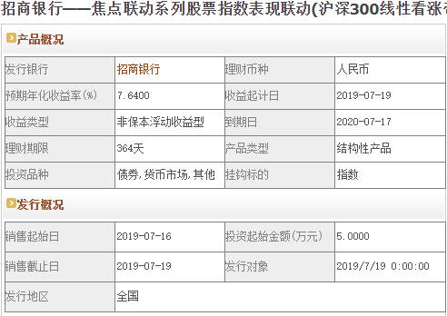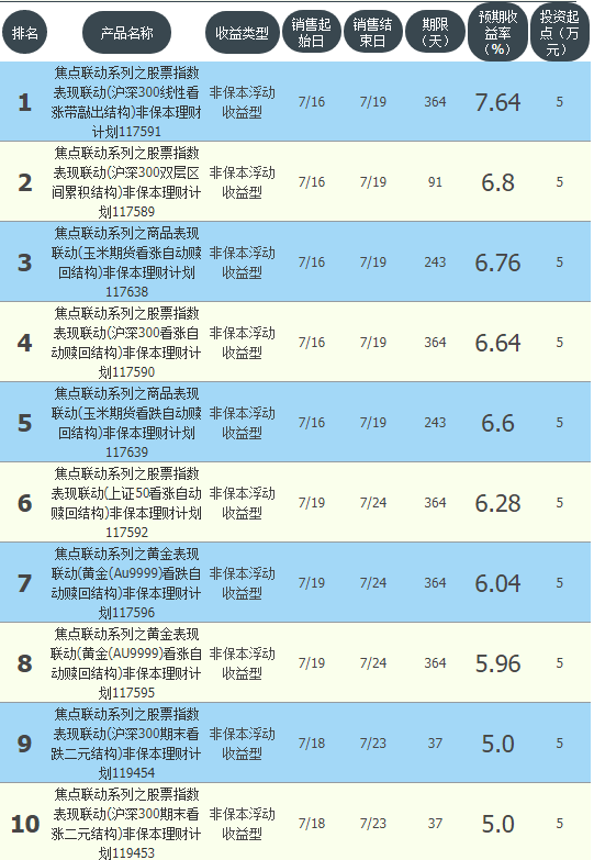 今日招商银行在售银行理财产品收益最高为“焦点联动系列股票指数表现联动(沪深300线性看涨带敲出结构)非保本理财计划117591”,该款产品理财期限为364天,最高预期收益为7.64%,投资起点为5万元,该款产品7月16日-7月19日面向全国发售。