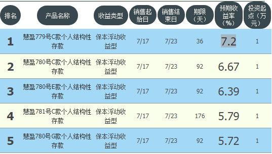 今日华夏银行在售银行理财产品收益最高为“慧盈779号C款个人结构性存款”,该款产品理财期限为36天,最高预期收益为7.2%,投资起点为1万元,该款产品7月17日-7月23日面向全国发售。
