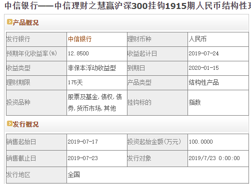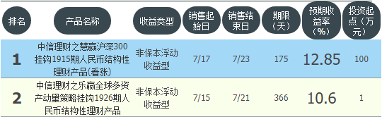 今日中信银行在售银行理财产品收益最高为“中信理财之慧赢沪深300挂钩1915期人民币结构性理财产品(看涨)”,该款产品理财期限为175天,最高预期收益为12.85%,投资起点为100万元,该款产品7月17日-7月23日面向全国发售。