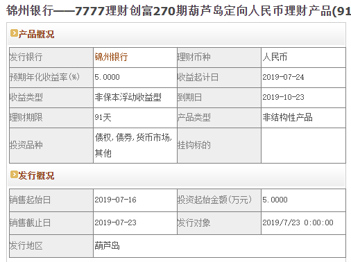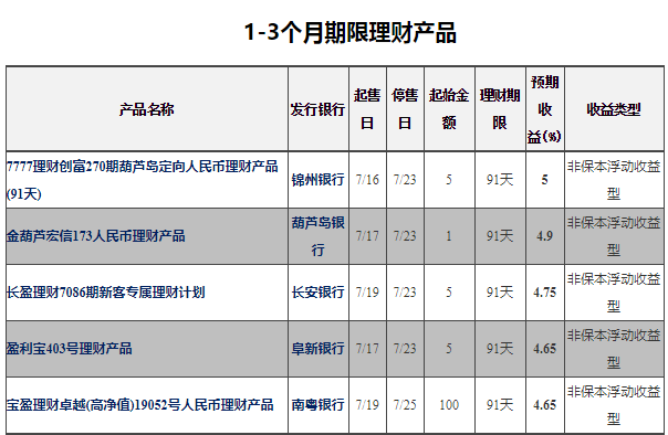 1-3个月银行理财中(非结构性)收益排名第一的为锦州银行——7777理财创富270期葫芦岛定向人民币理财产品(91天)人民币理财,预期最高收益率为5.0%。销售起始日:2019-07-16;销售截止日:2019-07-23;理财期限:91天;发行地区:葫芦岛。