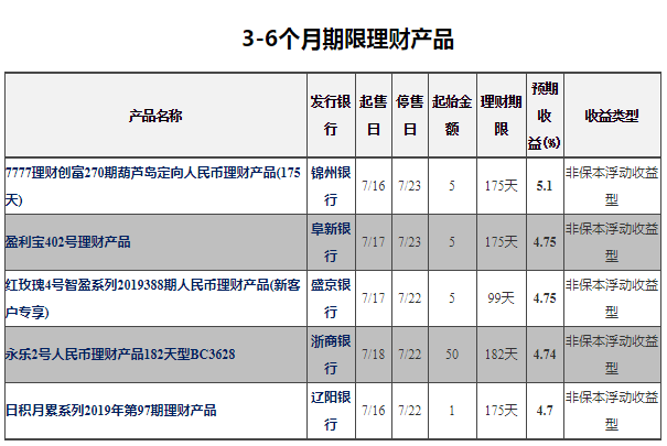 3-6个月银行理财中(非结构性)收益排名第一的为锦州银行——7777理财创富270期葫芦岛定向人民币理财产品(175天),预期最高收益率为5.1%。销售起始日:2019-07-16;销售截止日:2019-07-23;理财期限:175天;发行地区:葫芦岛。