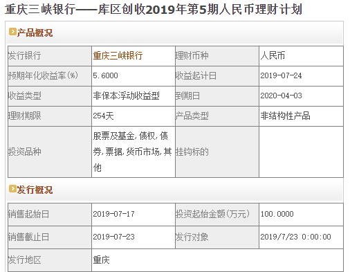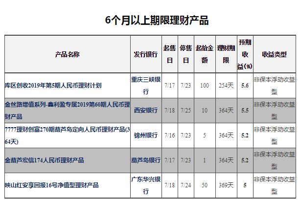 6个月及以上银行理财(非结构性)中收益排名第一的为重庆三峡银行——库区创收2019年第5期人民币理财计划,预期最高收益率为5.6%。销售起始日:2019-07-17;销售截止日:2019-07-23;理财期限:254天;发行地区:重庆。