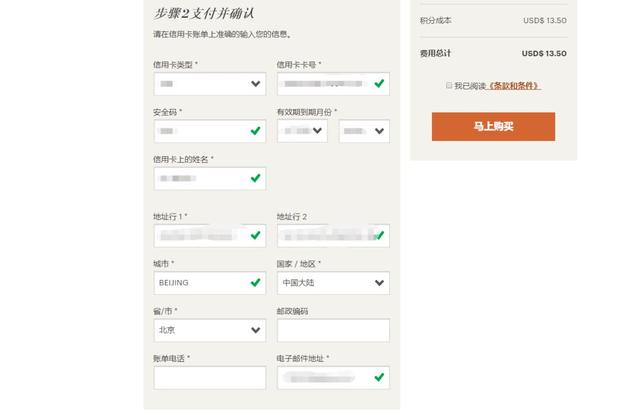在确认好要购买多少积分之后,填入你的信用卡信息,进行支付购买就行了。有一个很有意思的细节是,英文版的页面,在信用卡的国家/地区选项中,我找不到China的位置,毕竟国家是在太多了。但是把页面切换成中文以后,拉到最下面就是中国大陆。
