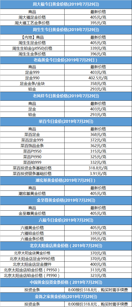 2019年7月29日今日黄金价格今天多少一克查询包括:周生生/周大福/六福珠宝/老庙黄金/老凤祥/菜百/太阳金店/潮宏基/金至尊黄金首饰价格查询。