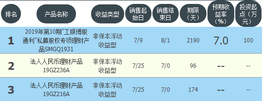 7月29日工商银行在售银行理财产品共有3款,平均收益率7.00%,其中保本型产品0款,平均收益率--;非保本产品3款,平均收益率7.00%。