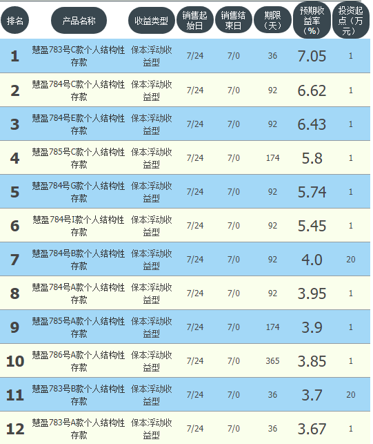 今日华夏银行在售银行理财产品收益最高为“慧盈783号C款个人结构性存款”,该款产品理财期限为36天,最高预期收益为7.05%,投资起点为1万元,该款产品7月24日-7月0日面向全国发售。