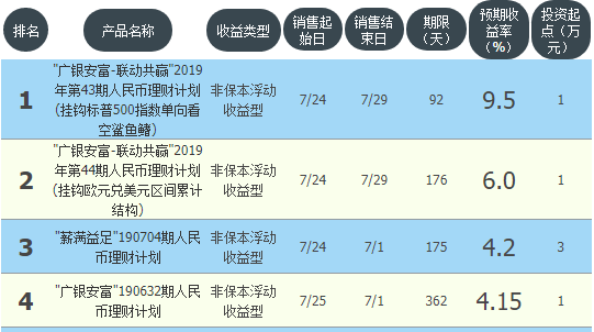 今日广发银行在售银行理财产品收益最高为“广银安富-联动共赢2019年第43期人民币理财计划(挂钩标普500指数单向看空鲨鱼鳍)”,该款产品理财期限为92天,最高预期收益为9.5%,投资起点为1万元,该款产品7月24日-7月29日面向北京,广东,河南,黑龙江,湖北,湖南,江苏,辽宁,山东,上海,四川,天津,新疆,云南,浙江发售。