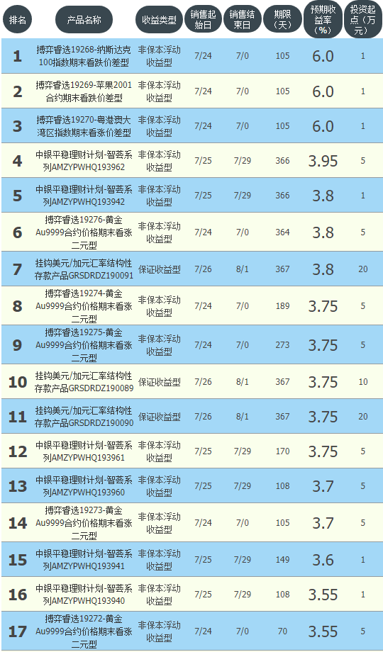 今日中国银行在售银行理财产品收益最高为“搏弈睿选19268-纳斯达克100指数期末看跌价差型”,该款产品理财期限为105天,最高预期收益为6.0%,投资起点为1万元,该款产品7月24日-7月0日面向全国发售。