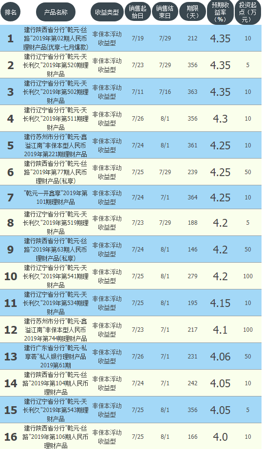 今日建设银行在售银行理财产品收益最高为“建行陕西省分行乾元-丝路2019年第02期人民币理财产品(优享-七月爆款)”,该款产品理财期限为212天,最高预期收益为4.35%,投资起点为10万元,该款产品7月19日-7月29日面向陕西发售。